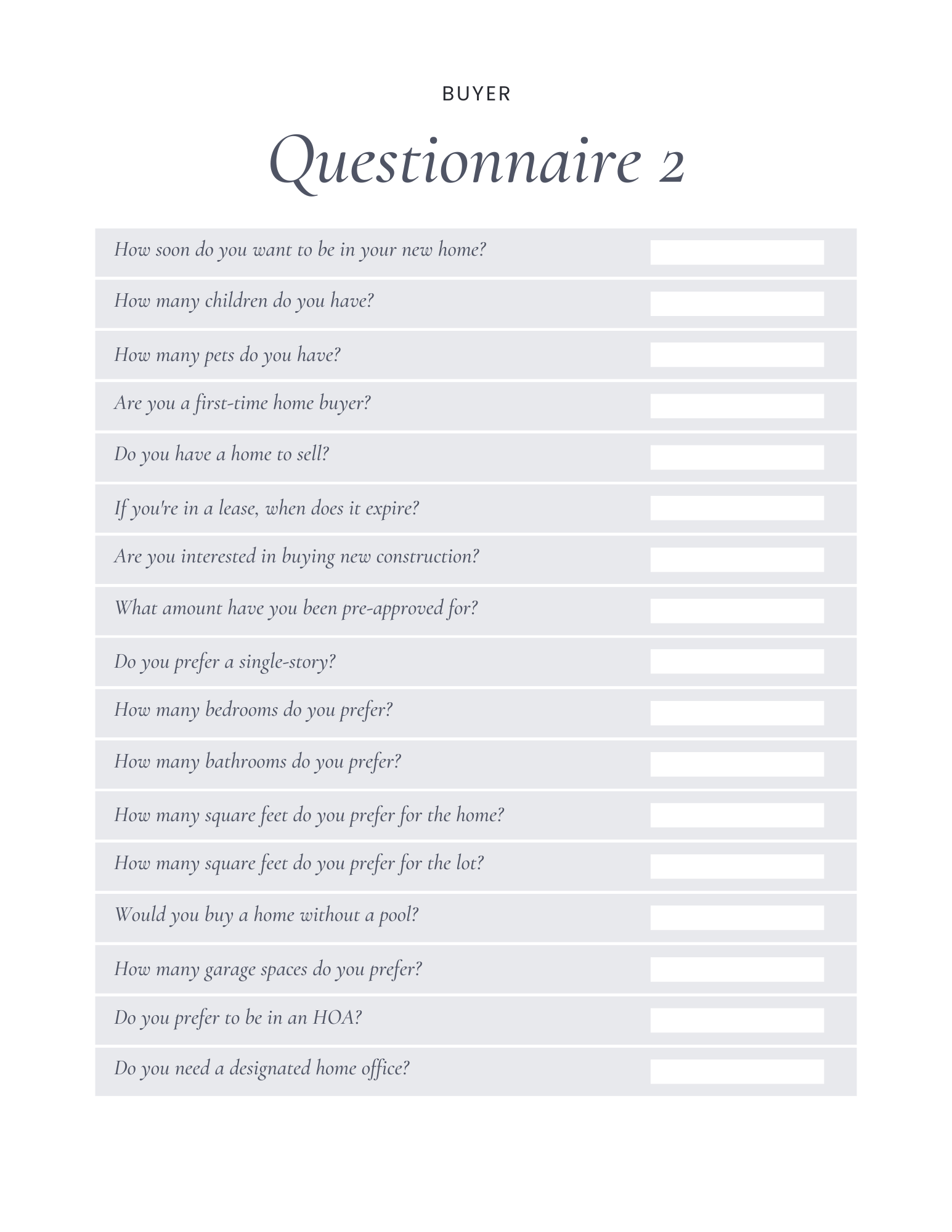 Use any or all of the worksheets here to use as a reference point for you and your agent during the house hunting process.